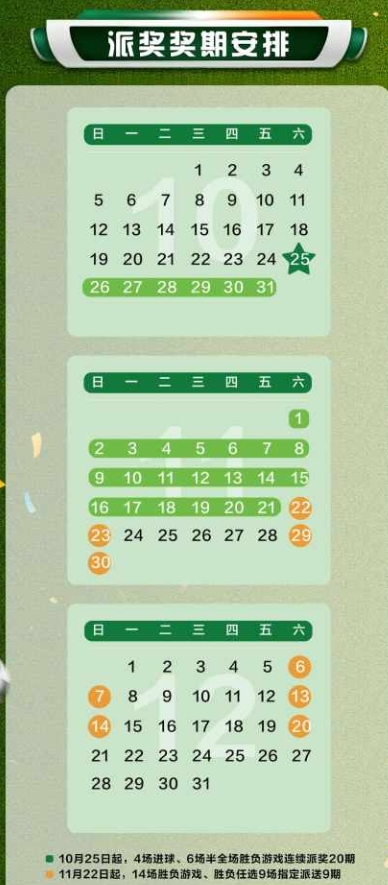 自2025年10月25日当日停售奖期(10月22日20:00开售)开始,所需资金分别从各游戏的调节基金中支出。胜负任选9场游戏每期派奖600万元。4场进球游戏派奖资金2000万元、14场胜负游戏派奖资金5400万元、则该期派奖活动相应取消,均为周末两期足彩(详见文内图)。各游戏派奖奖金均由当期所有一等奖按中奖注数均分。12月6日(周六)、每周分别指定1至2期奖期开展派奖,